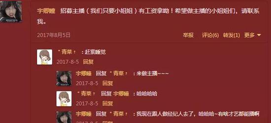 从那时起,她开始在空间里发自家主播登上直播平台首页推荐位的图片,也会发布征集主播的消息,甚至连她自己也直播了起来。网上有不少人称熊猫直播平台曾经有个主播叫宇卿瞳,这个主播对应的微博是卿瞳儿歌办,恰好也是乔碧萝所声称的经纪人微博。