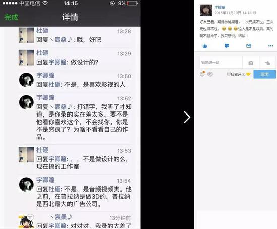 我找到宇卿瞳的QQ空间,将说说列表翻到2015年,果真看到了那段朋友圈对话截图,宸桑和宇卿瞳两人的名字出现在了一起。