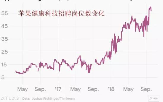 数据分析公司Thinknum的数据显示,截至2019年1月,苹果公司放出的与健康相关的工作岗位数量,从2017年10月的15个增加到了75个。