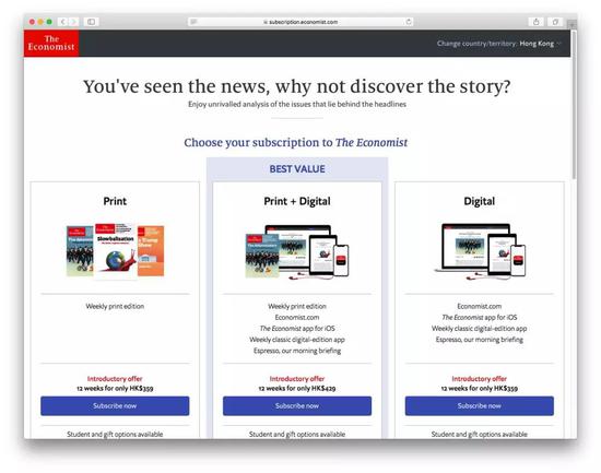 看这订购页面,就是不断被营销专家和增长黑客们提及的“价格锚定”的案例,傻子才(不)选最中间那档 Print+Digital。