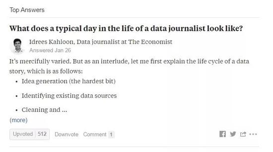 例如,数据记者 Idrees Kahloon 的一篇有关《作为数据记者的一天是怎样一种体验?》(没错我故意翻译成知乎体)的回答赢得了 400 万阅读量。