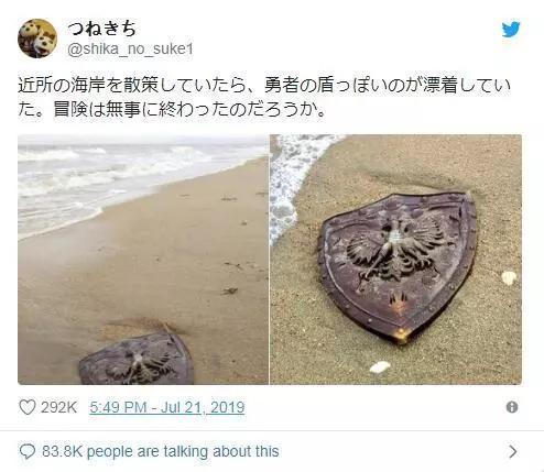 看这位朋友,他在海边散步的时候看到海里飘过来一面制作精良的盾牌,第一反应竟然不是赶紧把盾牌揣兜里回家卖废铁,而是拍照发推说: