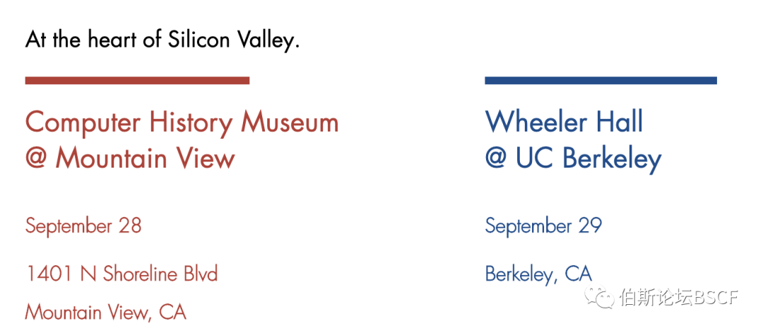 伯斯中国论坛 (BSCF) 是加州大学伯克利分校及斯坦福大学学生和校友联合举办的硅谷年度科技盛会,旨在为旧金山湾区广大在校学生、青年创业者、行业精英和跨境投资人提供跨越校际和国际的交流平台,促进中美的创新与科学技术互通。过往三届论坛吸引到了来自湾区学校和科技公司超过3500+名参会人员。