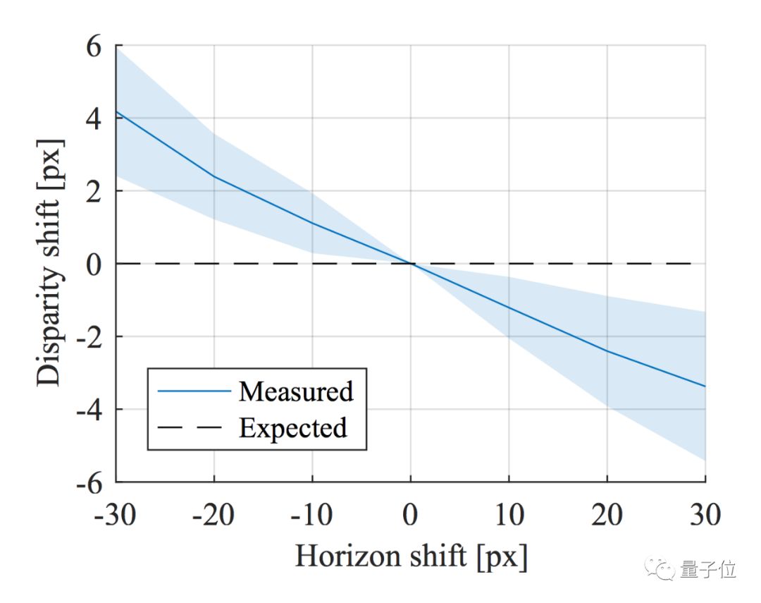 但是在第三行中,保持物体的纵坐标不变,只是缩放大小,整个神经网络的输出其实相当一致,并没有剧烈变化。(都注意预测中白框内的结果即可,也就是车尾的距离)下面是一个定量的结果: