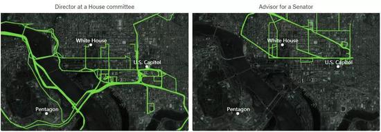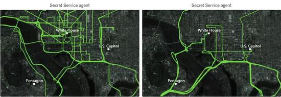如果连特朗普总统随行人员的手机都能追踪到,还有谁的能幸免于难?研究人员更进一步,通过位置数据分析了美国安全机构和政府机构的人流情况,甚至把这些政府高官和安全人员的行踪也绘制出来,大家感受下。