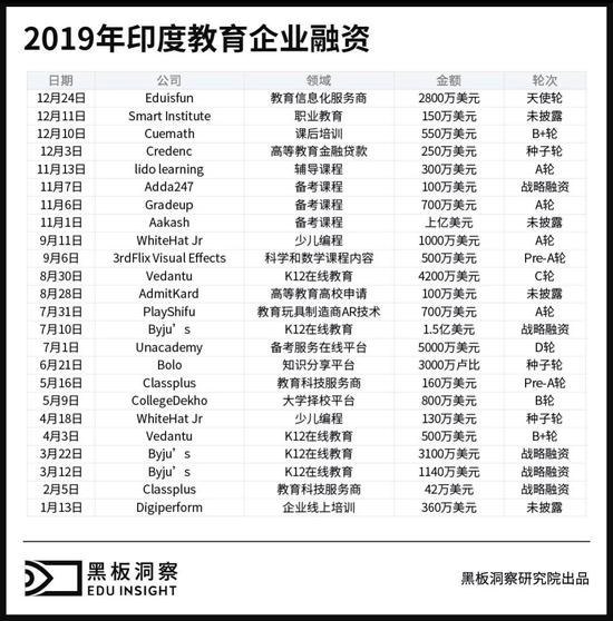 2019年Byju's获得了三轮融资,独角兽 Byju's 是印度 K12 在线教育平台中影响力最大、排名最高的产品,主要为在校学生提供原创学习内容、视频课程、以及互动教学活动。2017 年,Byju’s 获得了腾讯 4000 万美元的注资。除此之外,Byju’s 的投资方还包括红杉资本及Facebook 创始人马克扎克伯格夫妇创立的基金。