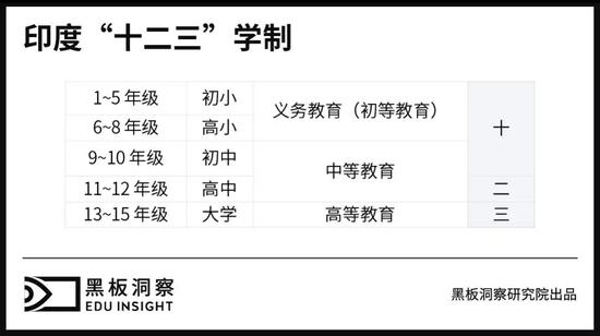 独立后,印度于 1950 年 1 月通过宪法,规定向 14 岁以下儿童提供 8 年的义务教育。在 1968 年,印度议会通过了《国家教育政策》,要求各邦均统一执行颁布的十二三制。十年阶段是面向全体学生提供无差别的一般教育,这十年中前八年为初等教育,为义务教育阶段,其中分初小(一至五年级)和高小(六至八年级)。中等教育包括九至十年的初中和十一至十二年级的高中阶段。两年阶段也称为高中,分为学术和职业技能,学术性的课程为升学做准备;职业性的课程为就业做准备。三年阶段是大专以上学历的学生去他们所选择的学科领域深造。