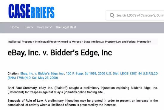 2000年,美国Bidder's Edge对Ebay网站进行了数据爬虫,Ebay因此向加利福利亚北区法院提起诉讼,理由包括:该爬虫行为违反了robot协议,具有非法侵入(trespass)、计算机欺诈和滥用、不公平竞争等违法行为。