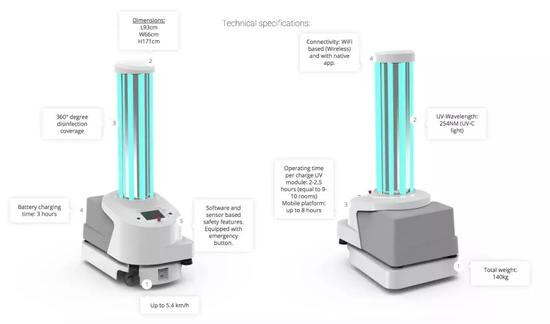 丹麦一家名叫UVD的机器人公司,就生产了一种机器人,能够在医院自动行走,并发出紫外线进行表面消毒。