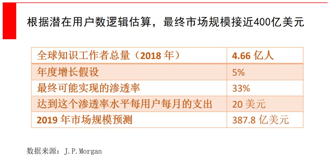 但ZOOM圈入了大量C端用户,这些都是高素质的知识工作者。在J.P.Morgan的市场测算模型中,则是基于国际劳工组织和LinkedIn的就业数据,全球大约有4-5亿知识工作者(knowledge workers),由于使用方便,如果最终远程视频和电话解决方案能够渗透其中三分之一,按每月20美元的订阅费,这个市场的潜在规模达到400亿美元。