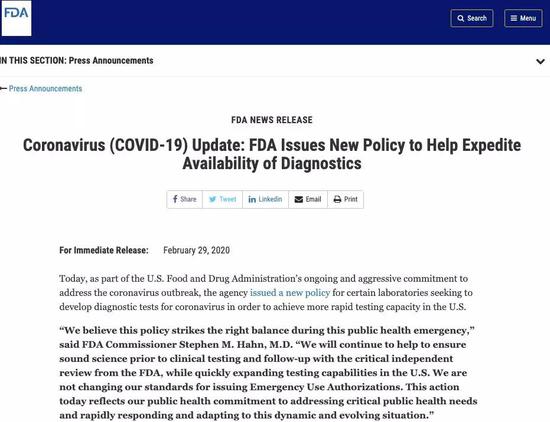FDA 局长 Stephen Hahn 指出,“我们认为新的政策能够在公共卫生紧急状态中取得平衡。”次日,美国卫生及公共服务部长 Alex Azar 也透露,已经准备好了7.5万支新的试剂盒,将会分发到全国各地的符合标准的临床实验室。