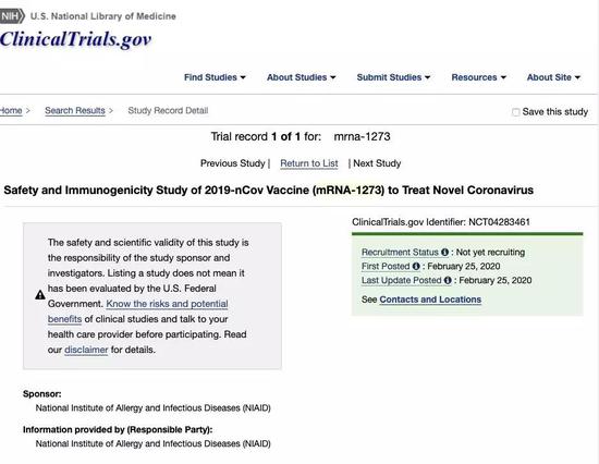 mRNA-1273 是一种新型脂质纳米颗粒(LNP)封装的信使 RNA 疫苗,可编码新冠病毒全长度、预融合稳定的棘突蛋白。Moderna 仅花了42天就生产出了第一批疫苗,并且已经送至 NIAID 位于马里兰州的实验室。该机构预计调查将在3月6日正式启动,但要到2021年6月1日才会正式结束。