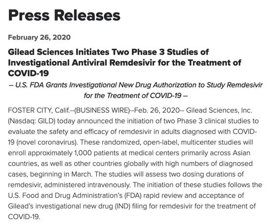 与此同时,2月26日,吉利德科学也宣布,在亚洲开展新的瑞德西韦用于新冠患者的第三阶段临床研究 (Phase 3 clinical studies)。地点将遍布除中国之外的亚洲国家,以及其它目前确诊患者数量较高的国家。