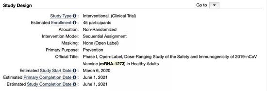 [4] Safety and Immunogenicity Study of 2019-nCov Vaccine (mRNA-1273) to Treat Novel Coronavirus https://clinicaltrials.gov/ct2/show/NCT04283461