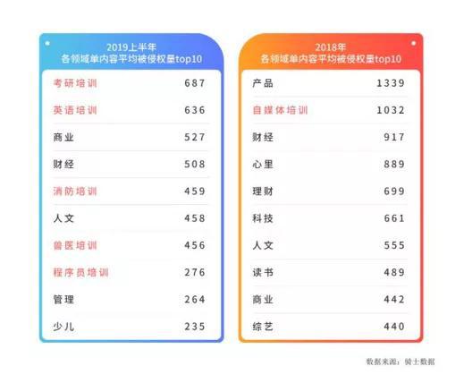 而去年维权骑士&鲸版权发布的《2019上半年内容行业版权报告》中,2018年上半年各领域单内容被侵权量top10榜单中,财经以917的数值高居第3,2019年上半年以508位居第4。