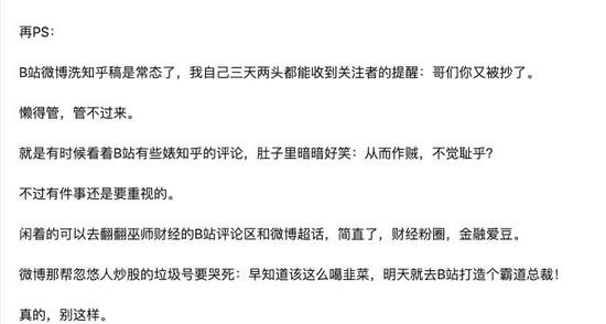 在如何看待巫师财经抄袭的知乎话题中,还有用户给了一个贴切的形容:B站是舞台,知乎是讲台,在舞台上借用或者模仿抄袭了别人的成果,观众不会管,自己看得开心就好,但是在讲台上做演讲,把别人的成果占为己用,台下的暴躁老哥不上去打两拳就给足面子了。