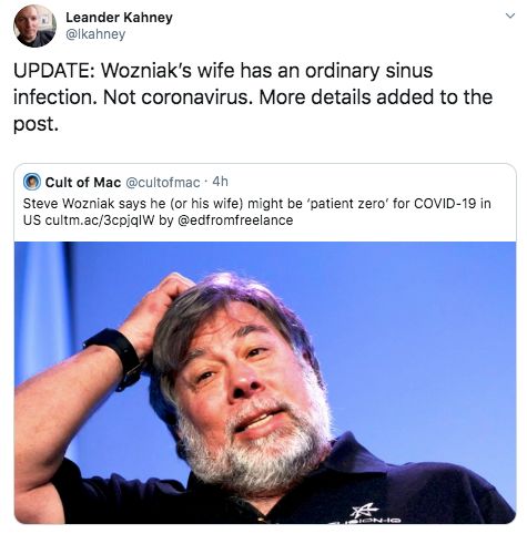根据纽约时报畅销书作家Leander Kahney发布的最新消息:Wozniak的妻子患有普通的鼻窦感染,而不是新冠病毒。