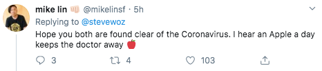 这位高赞网友的回复很巧妙:“希望你们俩都没有感染新冠病毒。我听说‘每天一个苹果、医生远离我’。”
