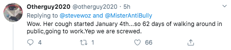 这位网友则表达了自己的担忧:“她的咳嗽始于1月4日,所以有62天的时间在公共场所出入、上班。是的,我们完了。”