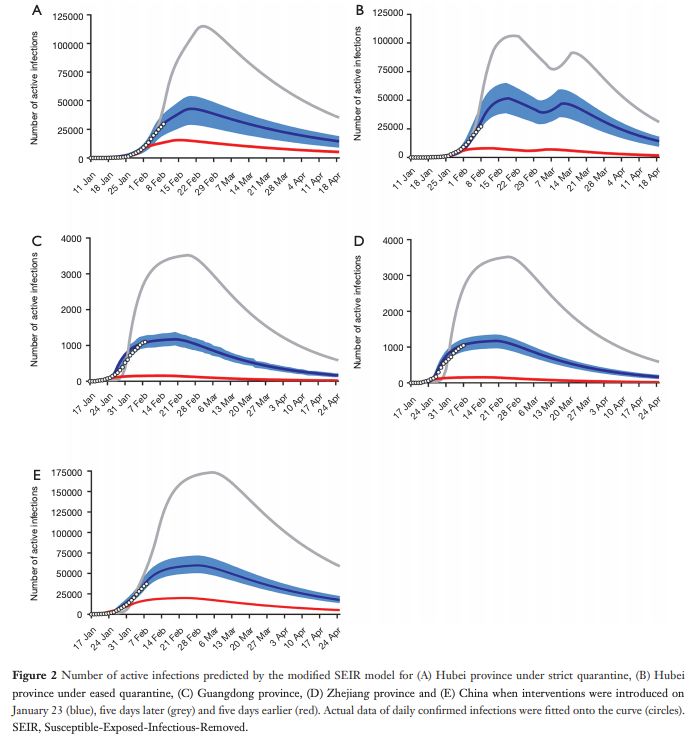 钟南山团队将1月23日之前和之后的人口迁移数据,以及最新的COVID-19流行病学数据,整合到SEIR模型中预测疫情发展走势。下图是修改后的SEIR模型预测的感染数量:(A)严格隔离的湖北省,(B)宽松隔离的湖北省,(C)广东省,(D)浙江省,(E)在1月23日(蓝色)五天后(灰色)和五天前(红色)进行干预时的中国。将每日确诊感染的实际数据拟合到曲线上(〇〇〇)。