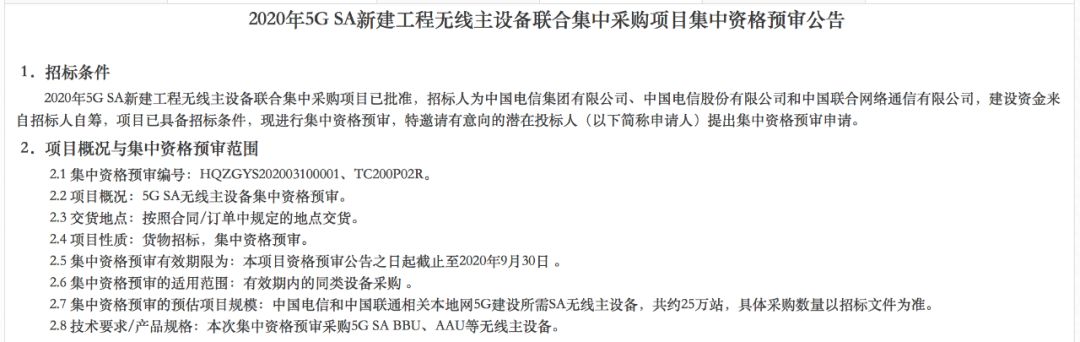 3月10日,电信和联通发布“2020年5G SA新建工程无线主设备联合集中采购项目集中资格预审公告”。