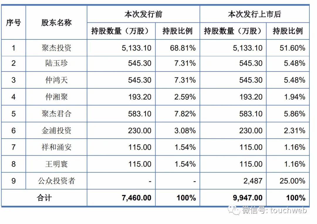 IPO后,仲湘聚直接和间接持股18.81%,仲鸿天直接和间接持股为18.28%,陆玉珍直接和间接持股为27.41%。