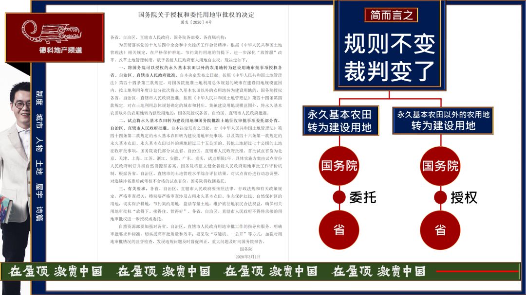 先说“裁判变了”,把权力从国务院下放到省市,里面有个小小的区别:如果是永久基本农田以外的农用地转为建设用地,国务院是直接“授权”给省市;如果是永久基本农田要转为建设用地,国务院是把权力“委托”给省市。