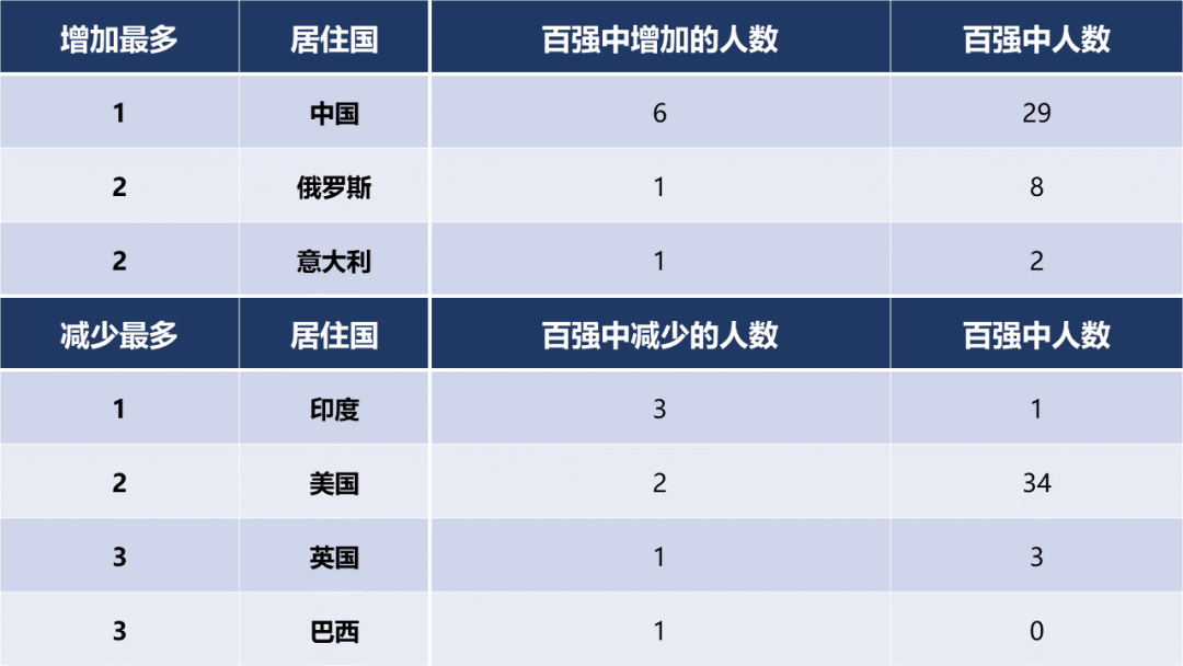 在2月-3月的两个月里,中国在全球百强企业家中增加了6人,是迄今为止增加最多的国家。印度减少了3人,美国减少了2人。百强中,美国现有34人,中国有29人。两个月前,美国有36人,中国只有23人。
