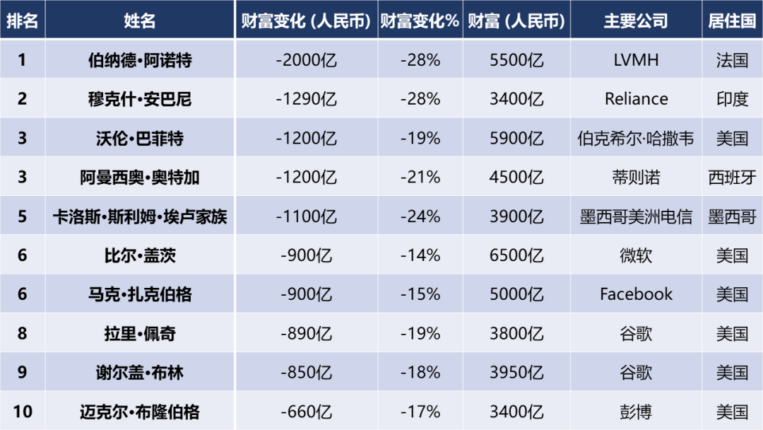 在过去两个月里,全球十大富豪总共损失了1.4万亿人民币的财富。