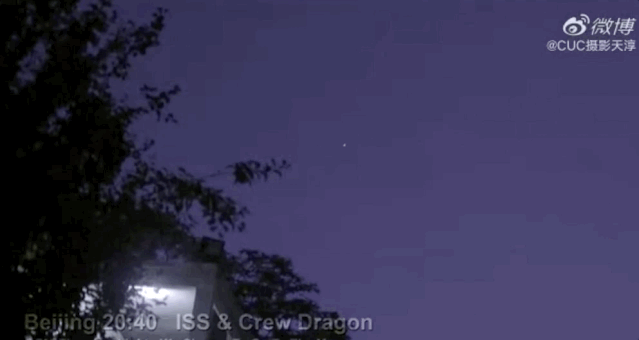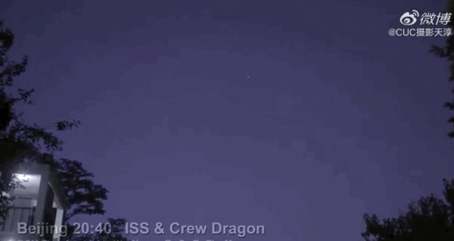 北京时间晚上20:40分,可以看到国际空间站清晰的轮廓,和跟在后面的龙飞船。