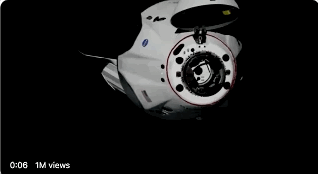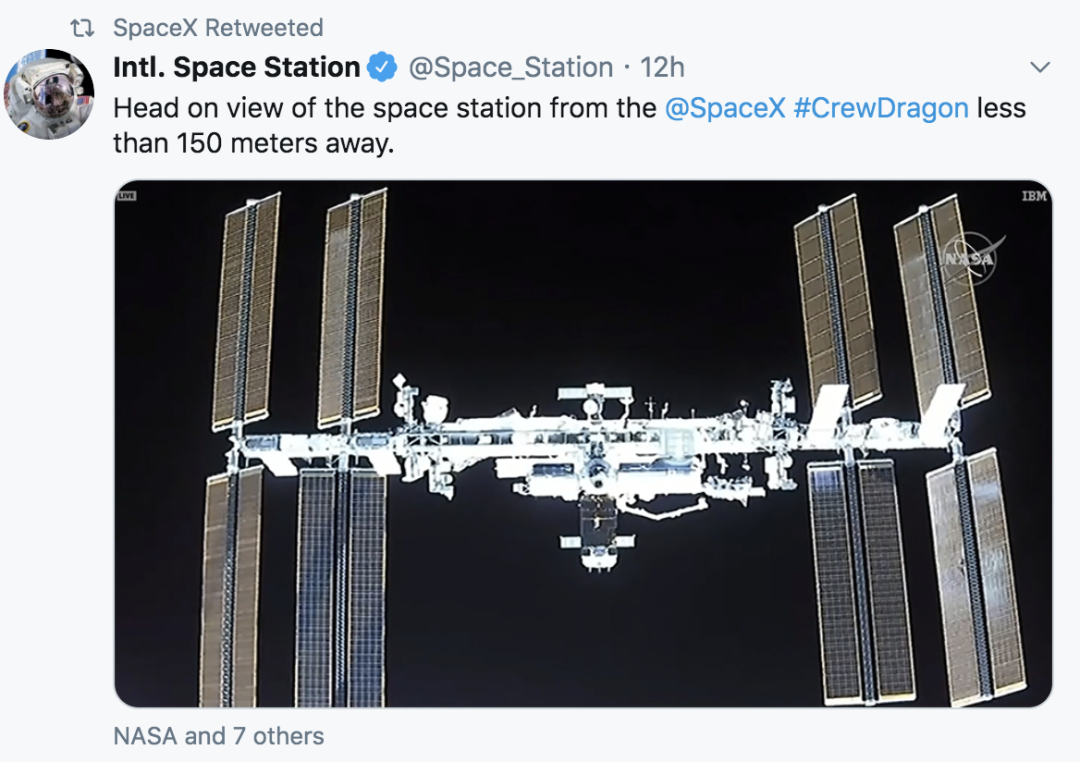 SpaceX的载人飞船发射约19小时后,北京时间5月31日晚10点27分,飞船上的12个钩型爪抓住空间站对接口,完成对接。