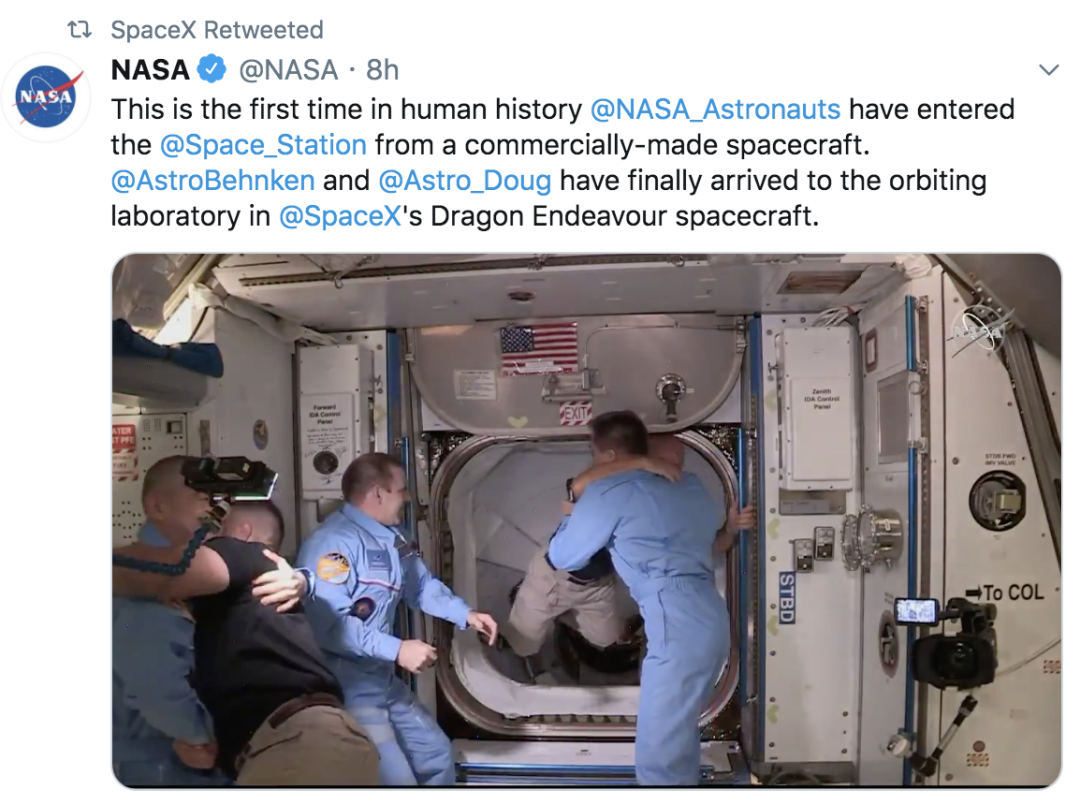 大约2小时后,北京时间5月31日凌晨1点02分,国际空间站的驻守宇航员打开舱门,龙飞船的两名宇航员进入国际空间站,与欢迎他们的Expedition 63任务组航天员握手拥抱。