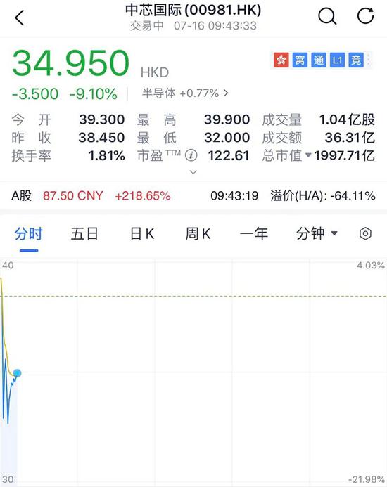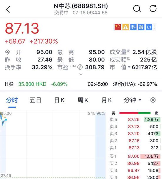 H股方面,中芯国际港股市场短线跳水,跌幅超11%。截止发稿,中芯国际科创板股价为87.13元/股。