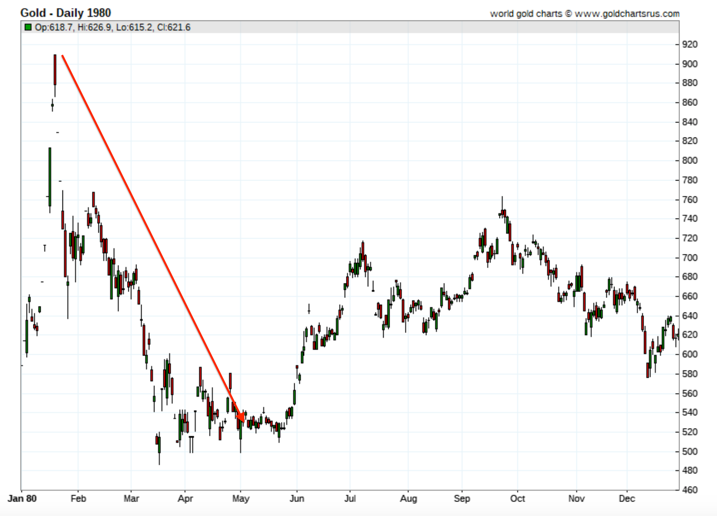 | 1980年黄金创出900多美元的历史新高之后暴跌