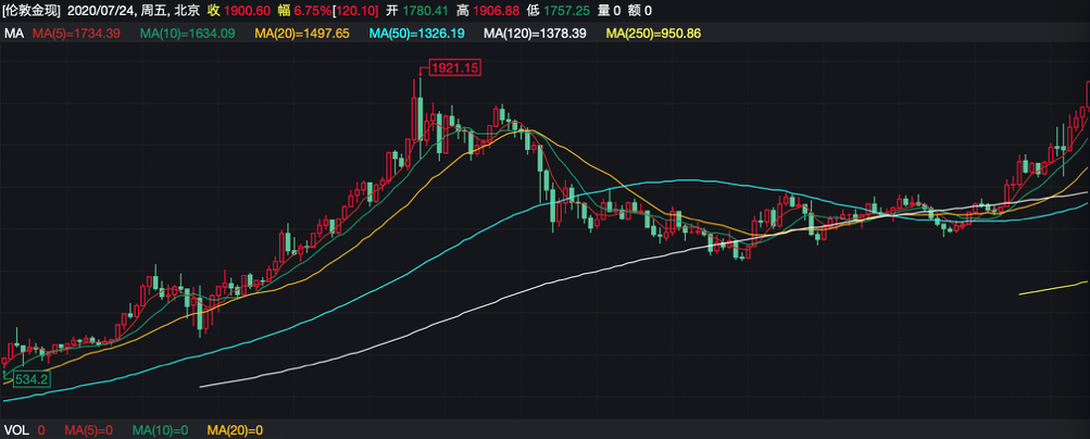 本周,国际金价一度突破1900美元/盎司,创9年新高,一周涨幅高达近5%约80美元。如果我们看伦敦金现货,其距离2011年的历史高点1921美元仅一步之遥。2018年11月时,众多机构开始看多黄金。当时,黄金现货价格仅1,223美元/盎司,至今涨幅已经高达50%。