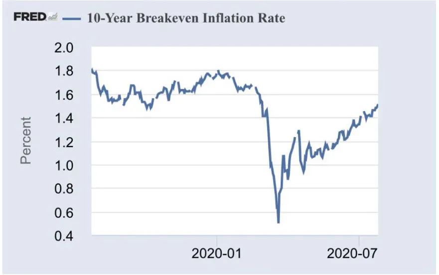 美国统计数据中,有一个衡量通胀预期的数据叫做“盈亏平衡通胀率(Breakeven Inflation Rate)”。这个数据的来源很简单,同期限的国债收益率减去通胀保值债券(TIPS)的收益率。