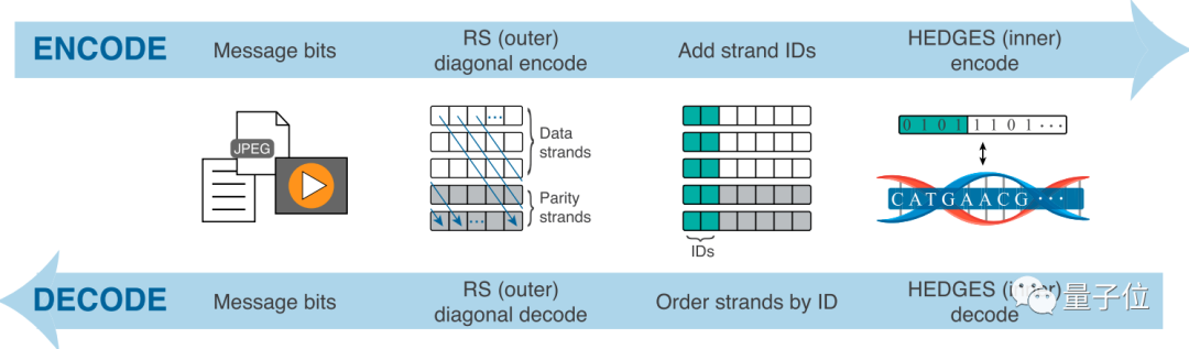 首先,输入的各种类型的数据信息会被转换成特定数据存储格式,然后通过一种名为RS(Reed–Solomon)的外部方式,进行基于DNA的存储。