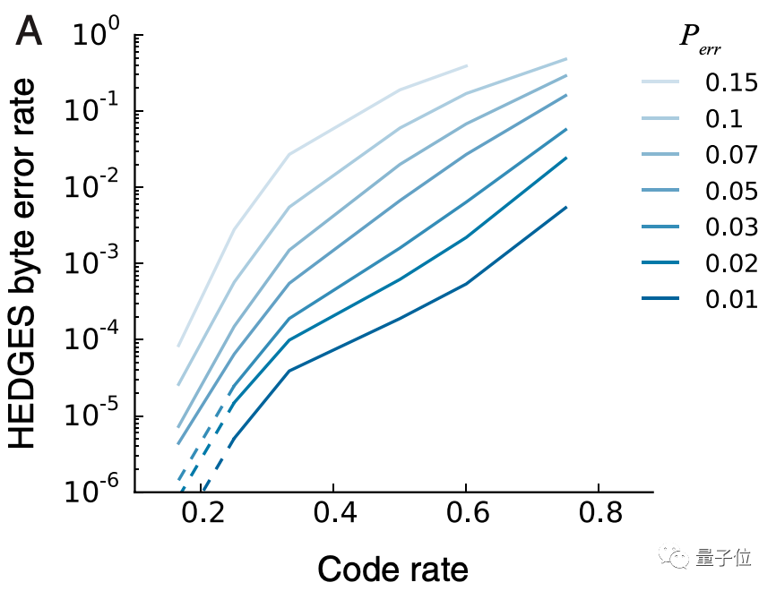 而从整体数据来看,采用HEDGES进行编码,在编码率小于0.2、每个核苷酸出错概率Perr小于0.01的时候,错误率理论上能逼近0。