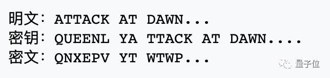 假设一方要传递「黎明时进攻」的明文,现在双方已知关键词是「QUEENLY」,那么密钥就是「QUEENLY+明文」,加密时,用维吉尼亚密码把「明文+密钥」翻译成密文。