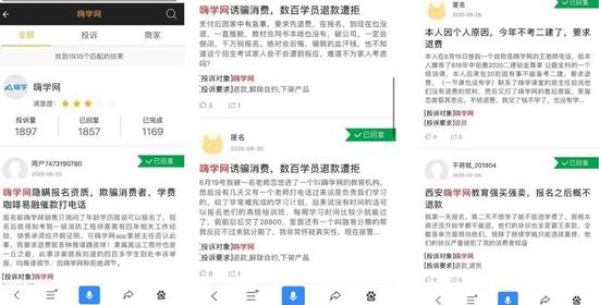 很多学员都陷入了交钱易、退钱难的境地,仅315晚会的邮箱就收到了数百封嗨学网的投诉邮件。在黑猫投诉平台上,嗨学网的投诉量多达1897个,大多数用户投诉的都是退费难问题。