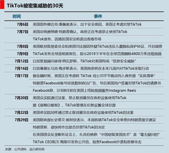 紧接着,美国联邦贸易委员会和司法部怀疑 TikTok 违反儿童隐私保护协议,启动新一轮调查。12 日,纳瓦罗宣称 TikTok 对美国构成“信息安全威胁”。四天后,白宫幕僚章马克·梅多斯表示,白宫将在未来几周内对 TikTok 采取制裁行动。很快市场传出消息,美国考虑将 TikTok 放入“实体清单”。