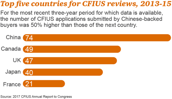 战力最强的可能就是美国海外投资委员会(CFIUS)。这个在二战前后成立的机构包括来自美国 16 个部门和机构的代表,其中包括国防部、国务院、商务部以及国土安全部。其职能为审查一切关乎美国的外国对美投资。CFIUS 在众多审查中重点关注的是是否有由于被外国收购方收购,被收购的美国企业的技术或资金可能会转移到被美国制裁的国家的可能。