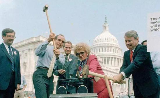 类似的一幕几年后挪到了华盛顿国会山前。9 名美国国会议员抡起大锤砸烂了日本东芝公司生产的一台收音机,以此来抗议日本向前苏联出售军用级电脑制导多轴铣床。后来这段录像被日本各大电视台反复播放,造成了相当大的影响。