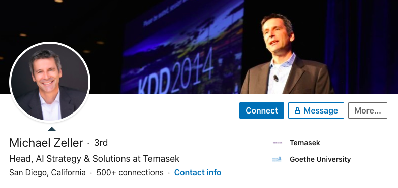 Zeller是Temasek人工智能战略与解决方案负责人,因致力于在ACM SIGKDD担任志愿司库和执行委员会秘书而在该领域做出的杰出贡献而获次荣誉。