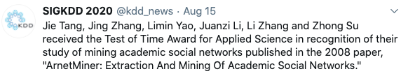 清华大学唐杰、张静、李娟子等人凭借他们在2008年发表的论文「ArnetMiner: Extraction and Mining of Academic Social Networks 」获得了该奖项,这篇论文主要关于学术社会网络挖掘。
