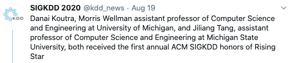 今年获得KDD 2020荣誉的华人有来自密歇根州立大学汤继良教授,清华大学唐杰、张静、李娟子等教授、还有美国阿肯色中央大学的盛胜利教授。