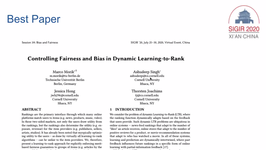 此外,值得一提的是,Joachims与其他合作者发表的一篇论文「Controlling Fairness and Bias in Dynamic Learning-to-Rank」在今年的SIGIR 2020上获得了最佳论文奖。