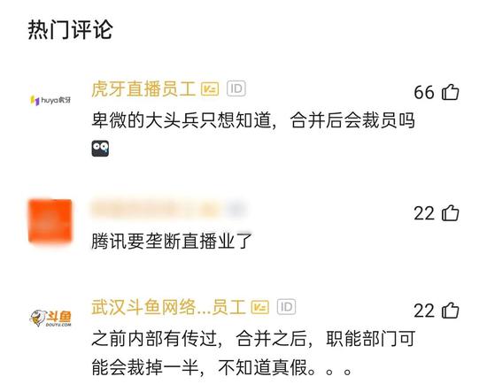 外界对此亦有诸多猜测,有人认为 ,斗鱼、虎牙合并后会将内容打通,但团队独立运营、品牌继续保留,用户可以通过一个平台,看到两家内容。也有网友开始讨论合并后的新名字,如“豆芽”“虎鱼’等。在职场社交平台“脉脉”上,有认证为斗鱼员工的用户表示,“之前内部有传过,合并之后,职能部门可能会裁掉一半,不知道真假。”