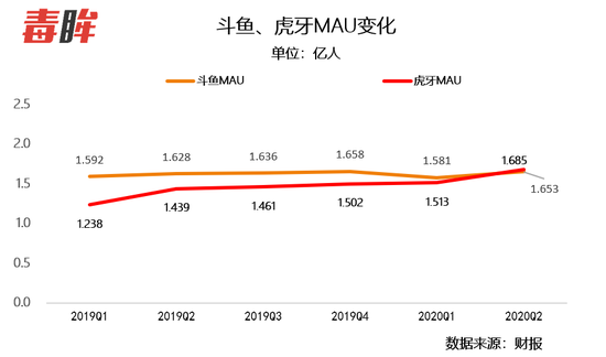 极光大数据显示,2020年6月,斗鱼、虎牙的用户重合率为31.6%。虎牙与斗鱼的MAU(月均活跃用户数)近一年稳步上升,斗鱼月活在2020年第二季度增长至1.653亿,同比增长250万人。虎牙今年二季度月活为1.685亿,同比增长17.1%。