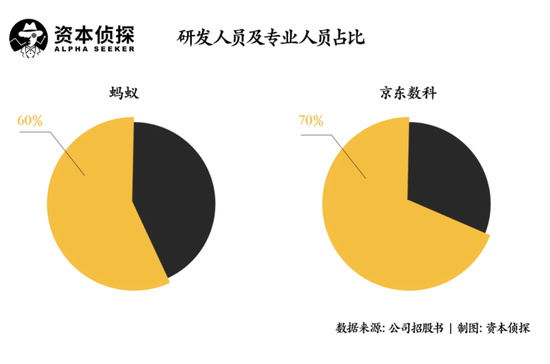 值得注意的是,两家公司都十分强调自身在技术、研发上的投入。根据双方招股书,2019年全年,蚂蚁集团研发费用占营业收入的比例为8.8%;京东数科同期研发费用占当期营业收入的比例为14.1%。